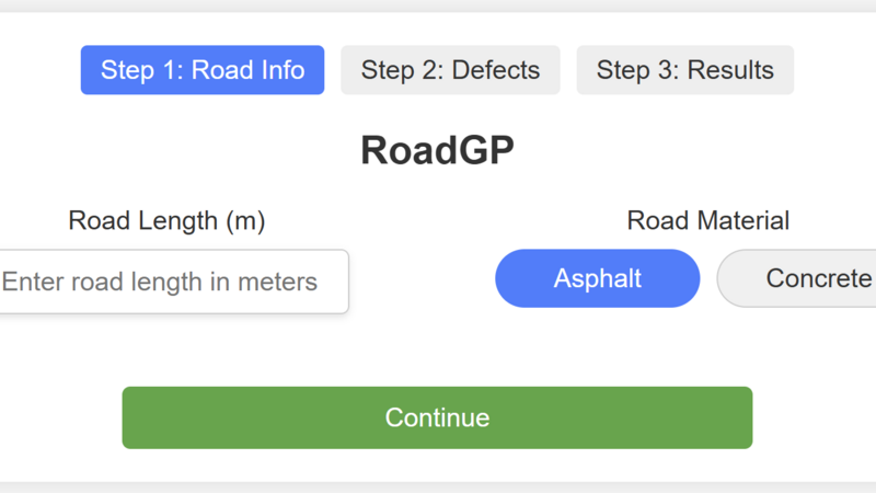 RoadGP is a browser-based tool that guides users through a step-by-step process to diagnose road defects. By entering basic road information and selecting any observed issues, the tool suggests likely causes and offers potential repair strategies.