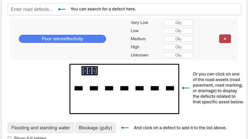 - Choose observed defects – Select defects using the search list or the road diagram, and indicate severity and quantity.